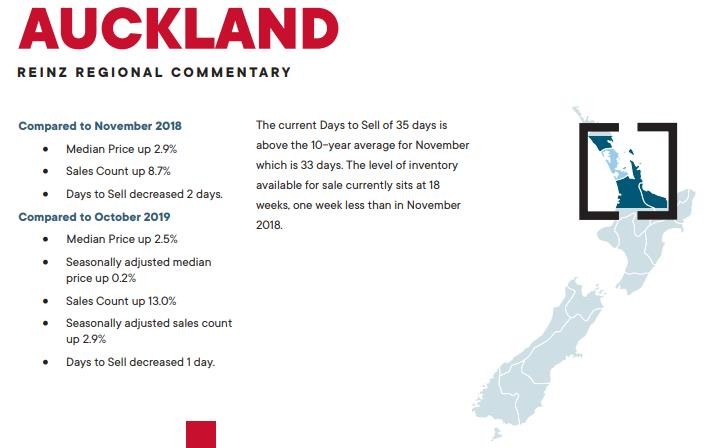 Article supplied by REINZ: The Real Estate Institute of NZ (REINZ) released its November monthly property report on 13th December. Bindi Norwell, CEO of REINZ commented “The Auckland market has seen prices increase for three months in a row, suggesting that we’re now entering a new normal for the country’s biggest real estate market where the increasing levels of confidence in the property market coupled with low interest rates and a lack of choice of new listings means that people are prepared to pay more for properties than they were a few months ago. The median price for Auckland represents a $22,000 increase since last month and is the highest price increase in 32 months,”